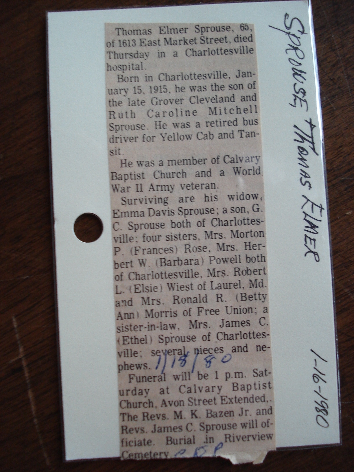 + 323 viii. Thomas "Tom" Sprouse was born circa 1931 in Augusta County, Virginia, USA.