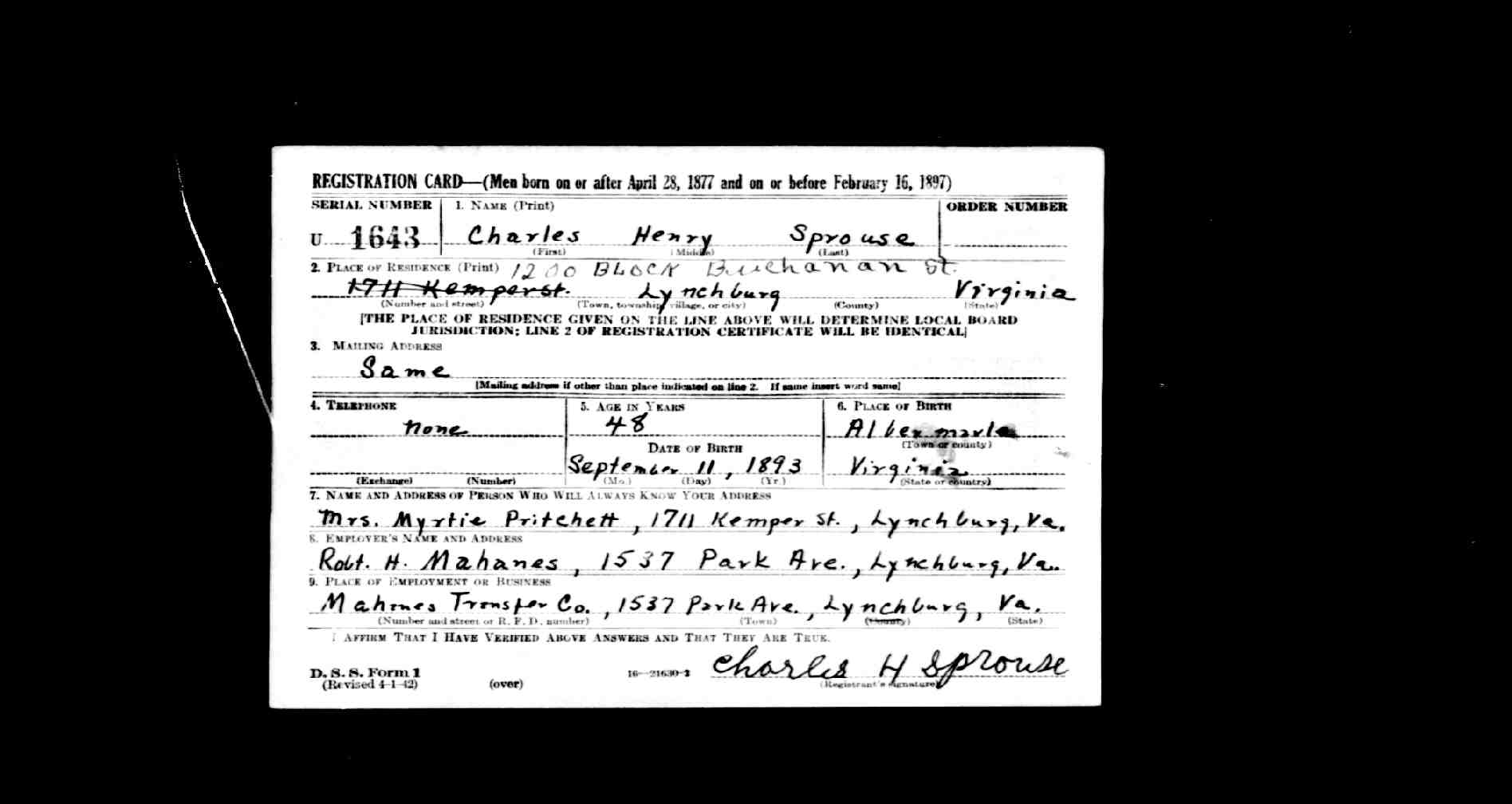 848. World War I Civilian Draft Registration Card, Herbert Author Sprouse.