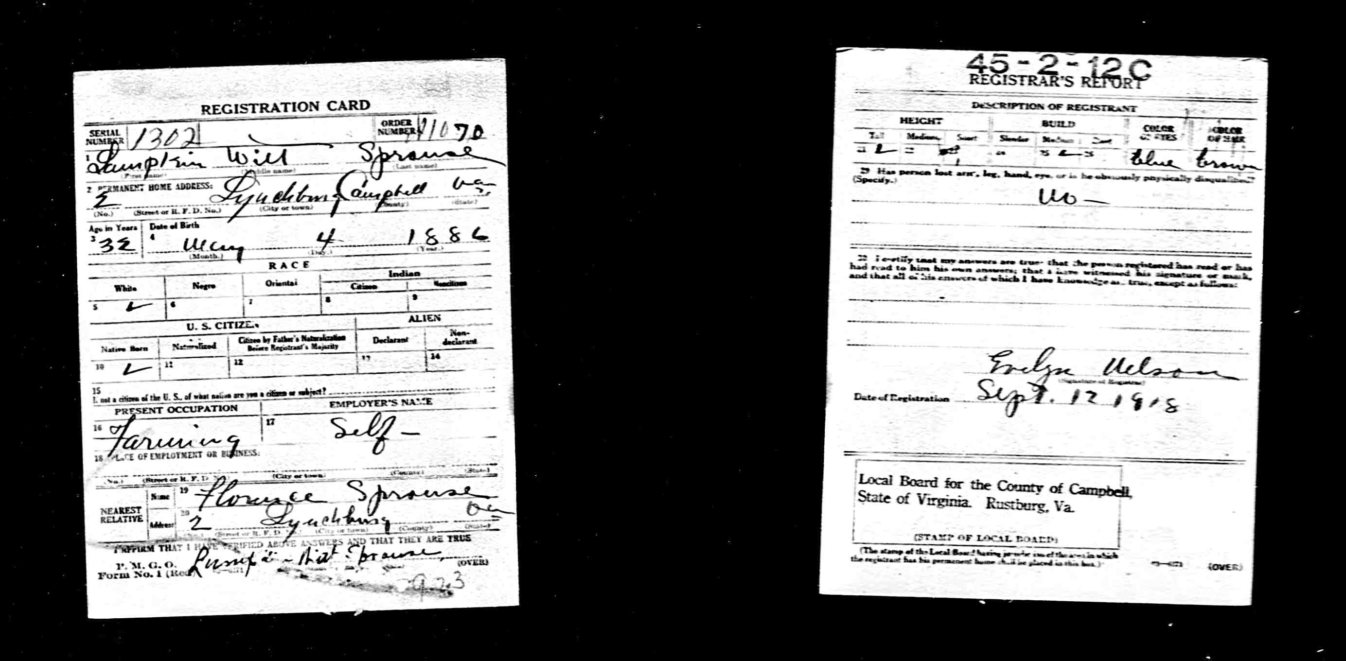 863. World War I Civilian Draft Registration Card, Lenwood Sprouse.